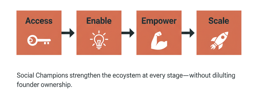 Social Champions enable ownership, not control. They provide capital, access, partnerships, and credibility—allowing PWD entrepreneurs to lead, operate, and grow independent businesses.