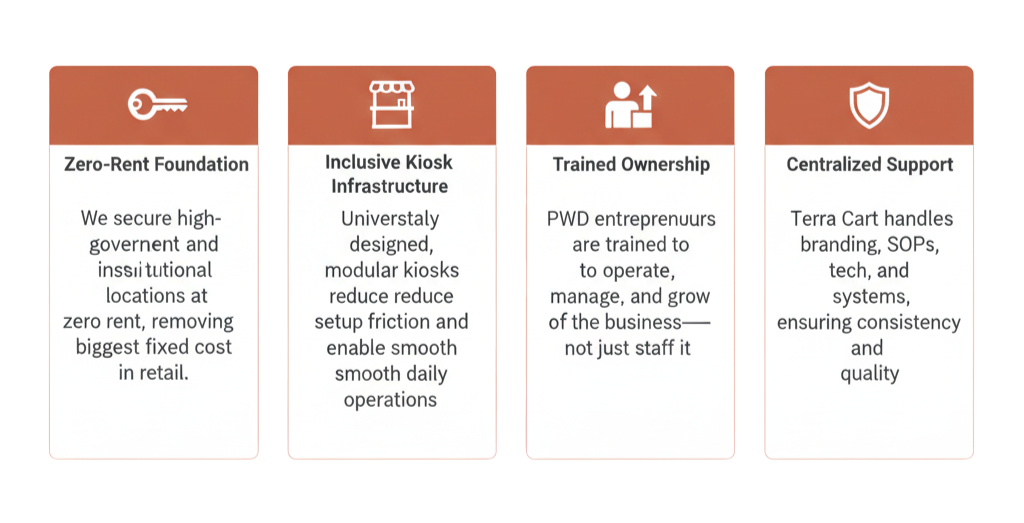 The Terra Cart Ecosystem is a complete, end-to-end system designed to transform inclusion into ownership. It connects government access, inclusive design, training, technology, and operations—so Social Champions can focus on people, service, and growth.