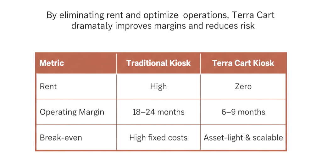 With standardized kiosks, centralized systems, and repeatable partnerships, Terra Cart can scale across cities, states, and countries without losing quality or dignity.
